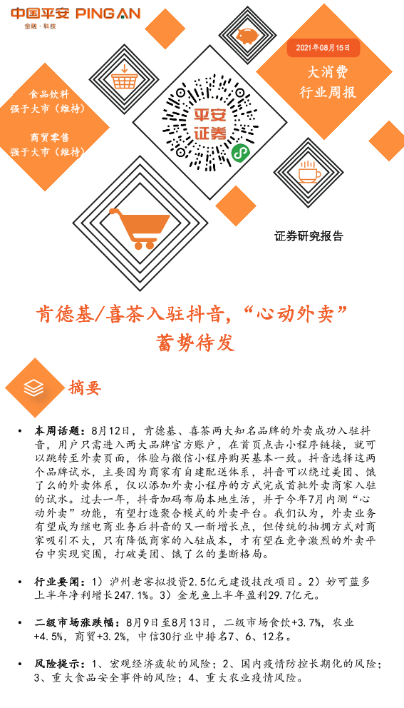 【平安证券】【20210815】大消费行业周报:肯德基 喜茶入驻抖音,“心动外卖”蓄势待发-4页