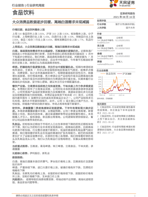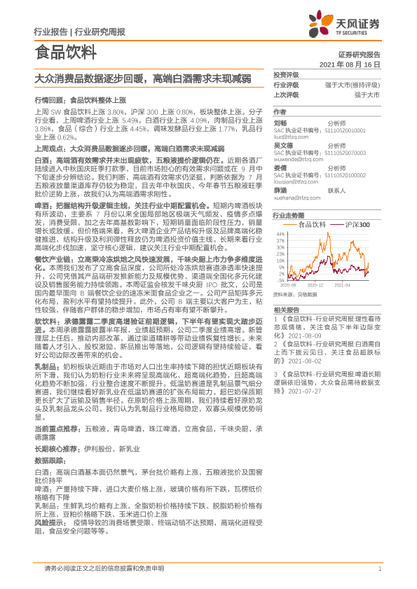 【天风证券】【20210816】食品饮料行业研究周报:大众消费品数据逐步回暖,高端白酒需求未现减弱-8页