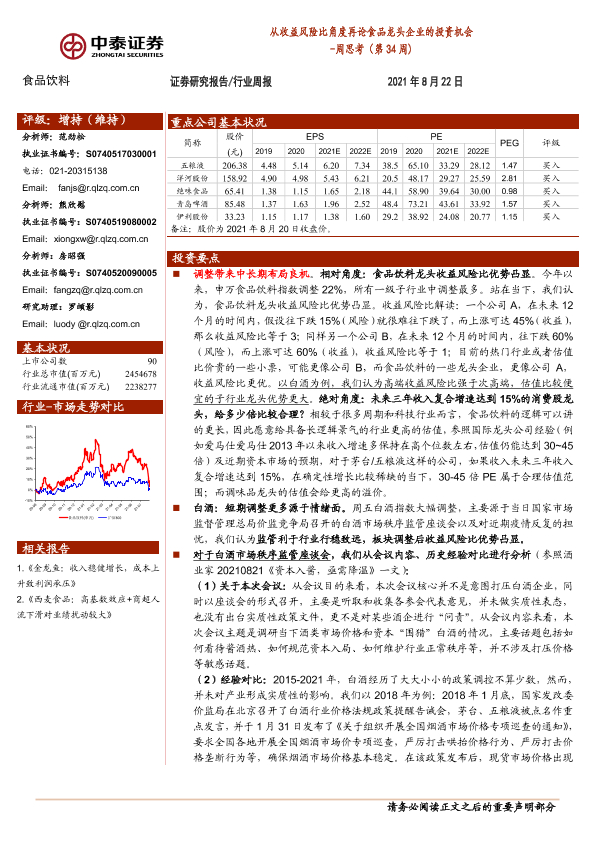 投资机会 收益风险比 行业周报 食品饮料 龙头企业