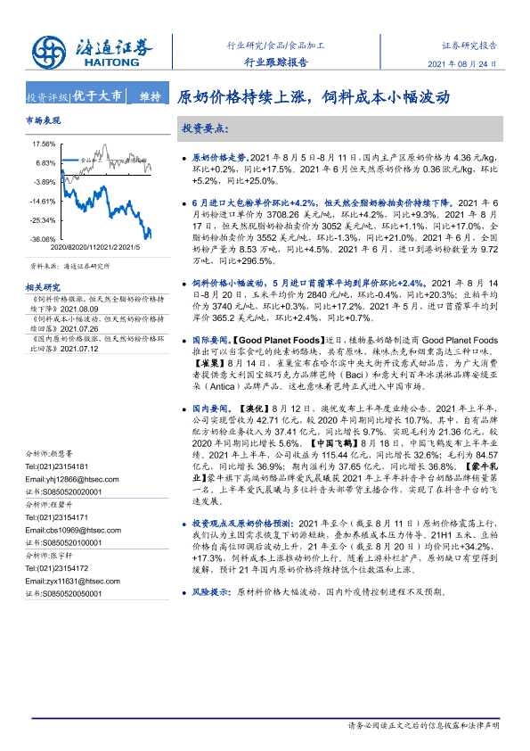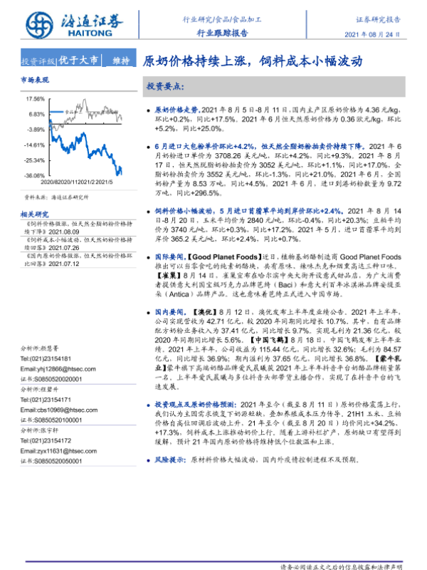 【海通证券】【20210824】食品加工:原奶价格持续上涨,饲料成本小幅波动-10页
