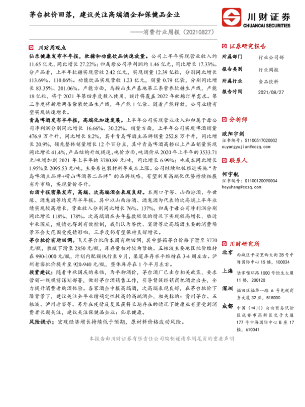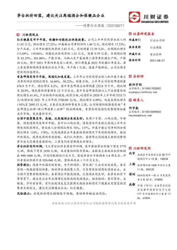 【川财证券】【20210827】20210827-川财证券-消费行业周报:茅台批价回落,建议关注高端酒企和保健品企业-13页