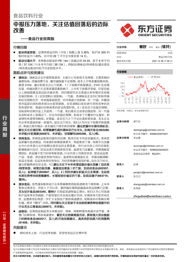 【东方证券】【20210905】20210905-东方证券-食品行业双周报:中报压力落地,关注估值回落后的边际改善-16页