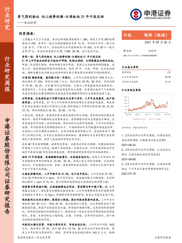 【申港证券】【20210905】食品饮料行业研究周报:白酒板块21年中报总结:景气得到验证 向上趋势延续-14页