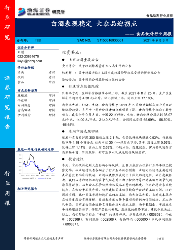 【渤海证券】【20210908】食品饮料行业周报:白酒表现稳定 大众品迎拐点-11页