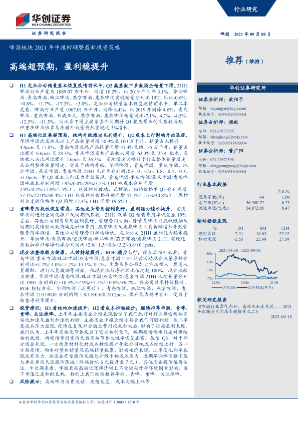 【华创证券】【20210908】啤酒板块2021年中报回顾暨最新投资策略:高端超预期,盈利稳提升-12页