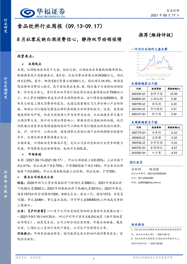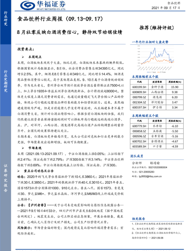 【华福证券】【20210917】食品饮料行业周报:8月社零反映白酒消费信心,静待双节动销佳绩-7页