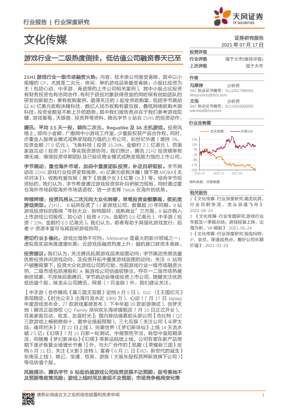 【天风证券】【20210717】文化传媒行业:游戏行业一二级热度倒挂,低估值公司融资春天已至-16页