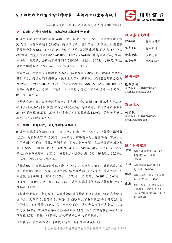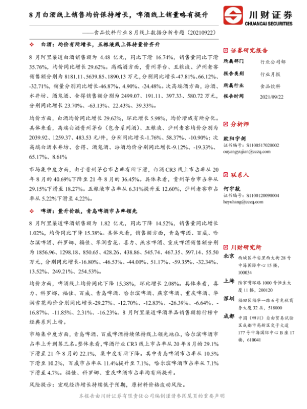 【川财证券】【20210922】食品饮料行业8月线上数据分析专题:8月白酒线上销售均价保持增长,啤酒线上销量略有提升-12页