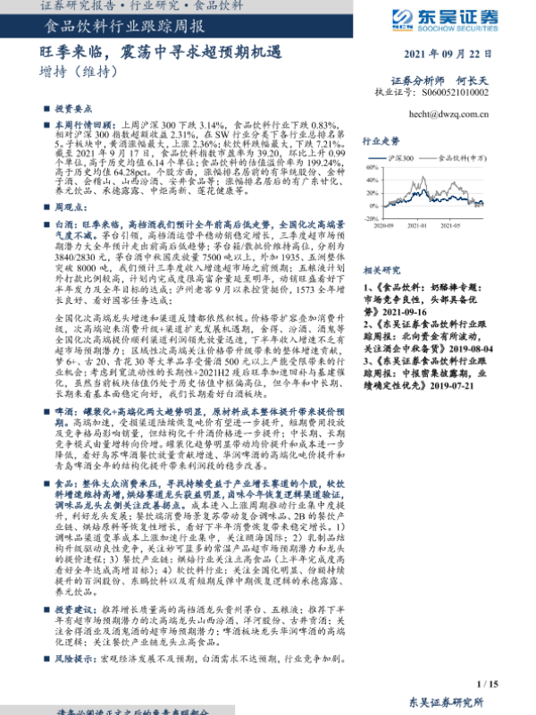 【东吴证券】【20210922】20210922-东吴证券-食品饮料行业跟踪周报:旺季来临,震荡中寻求超预期机遇-15页