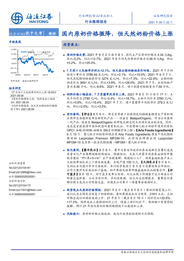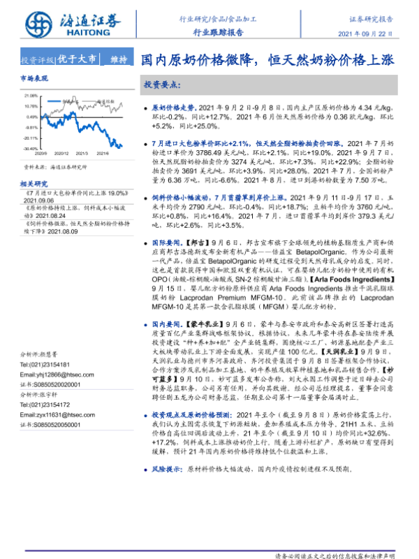 【海通证券】【20210922】食品加工行业跟踪报告:国内原奶价格微降,恒天然奶粉价格上涨-10页
