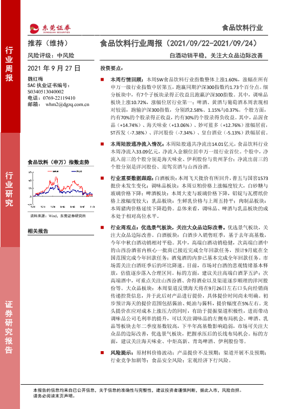 【东莞证券】【20210927】食品饮料行业周报:白酒动销平稳,关注大众品边际改善-14页