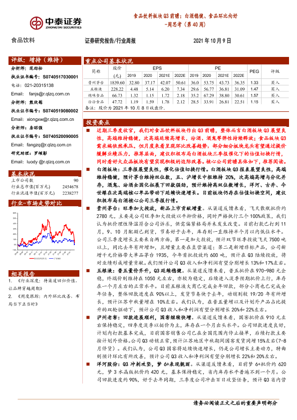 【中泰证券】【20211009】食品饮料周思考(第40周):食品饮料板块Q3前瞻:白酒稳健、食品环比向好-11页