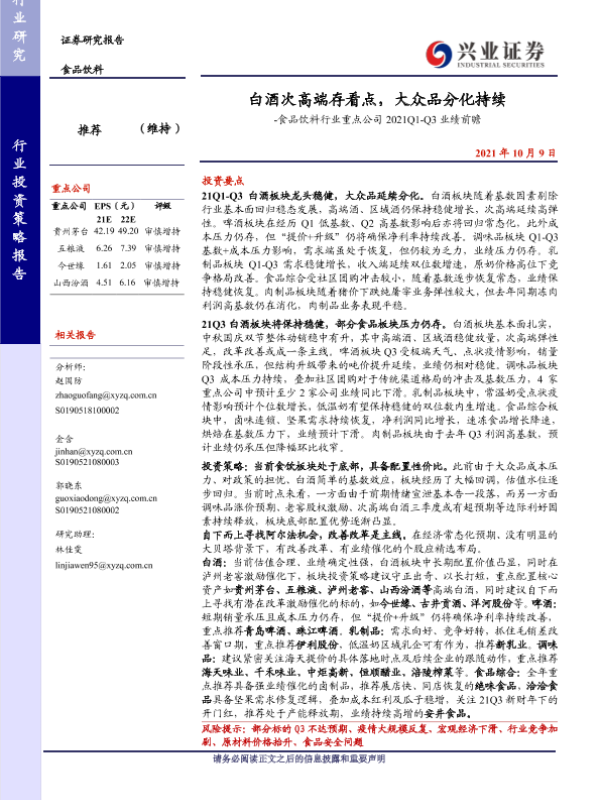 【兴业证券】【20211009】20211009-兴业证券-食品饮料行业重点公司2021Q1-Q3业绩前瞻:白酒次高端存看点,大众品分化持续-5页