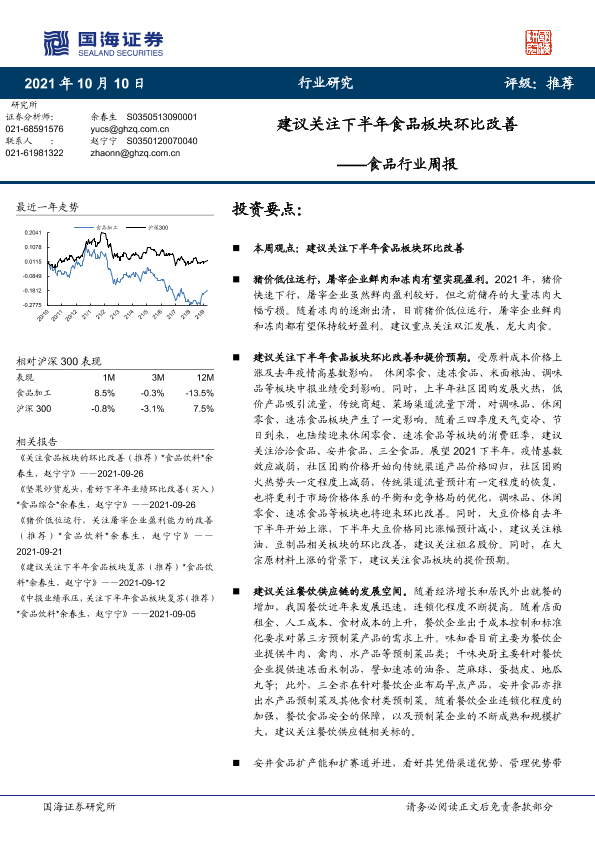 【国海证券】【20211010】20211010-国海证券-食品行业周报:建议关注下半年食品板块环比改善-16页