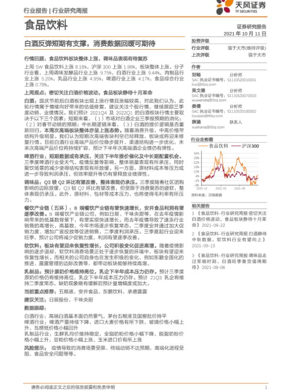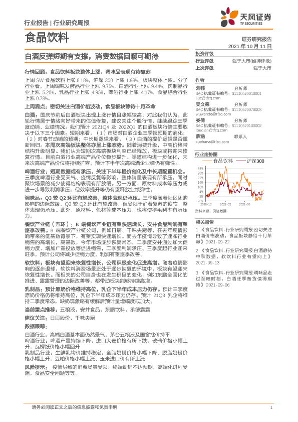【天风证券】【20211011】食品饮料:白酒反弹短期有支撑,消费数据回暖可期待-7页