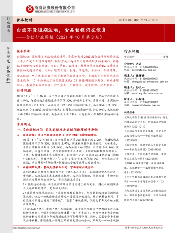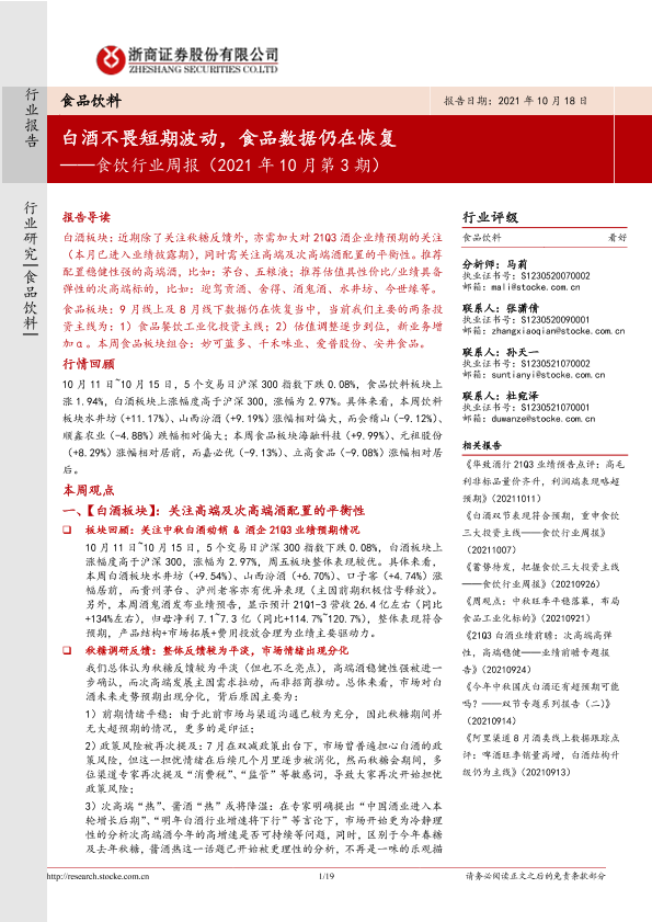 【浙商证券】【20211018】20211018-浙商证券-食饮行业周报(2021年10月第3期):白酒不畏短期波动,食品数据仍在恢复-19页