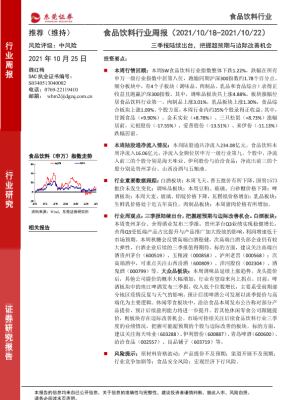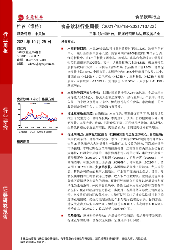【东莞证券】【20211025】20211025-东莞证券-食品饮料行业周报:三季报陆续出台,把握超预期与边际改善机会-14页