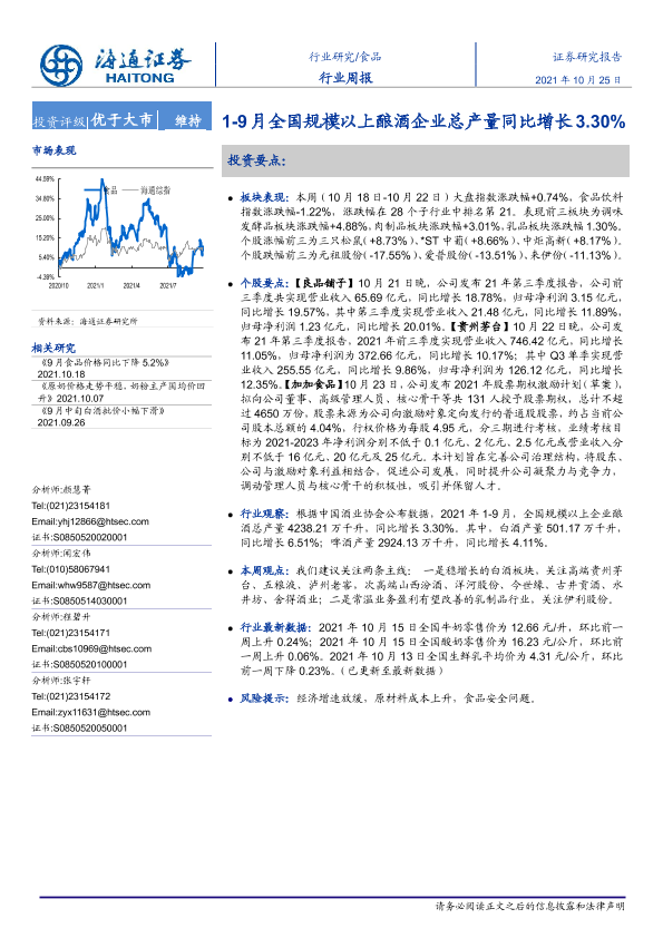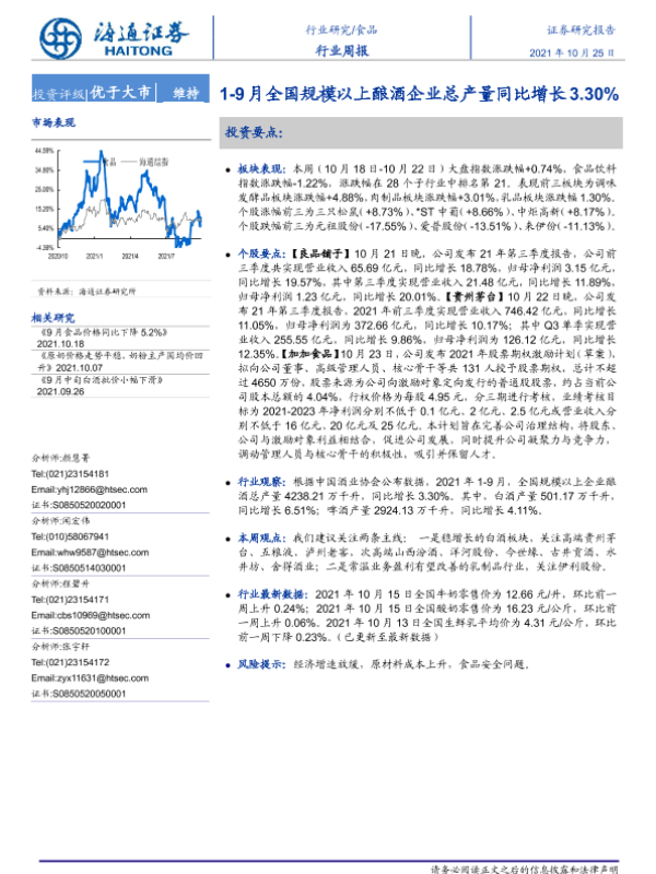 【海通证券】【20211025】20211025-海通证券-食品行业周报:1-9月全国规模以上酿酒企业总产量同比增长3.30%-7页