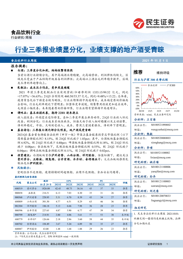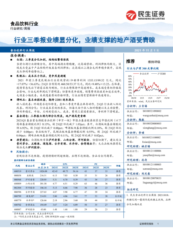 【民生证券】【20211101】食品饮料行业:行业三季报业绩显分化,业绩支撑的地产酒受青睐-19页