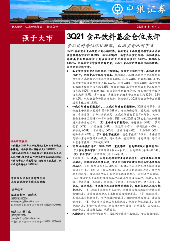 【中银证券】【20211104】3Q21食品饮料基金仓位点评:食品饮料仓位环比回落,白酒重仓比例下滑-6页