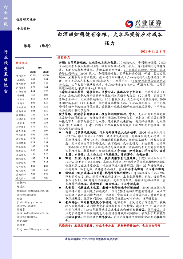 【兴业证券】【20211108】20211108-兴业证券-食品饮料:白酒回归稳健有余粮,大众品提价应对成本压力-43页