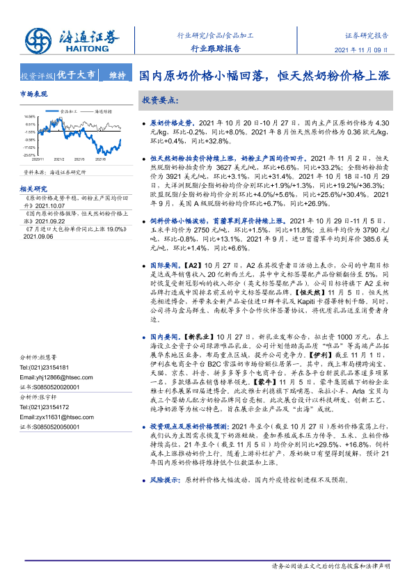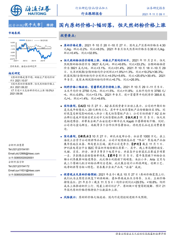 【海通证券】【20211109】食品加工行业跟踪报告:国内原奶价格小幅回落,恒天然奶粉价格上涨-10页