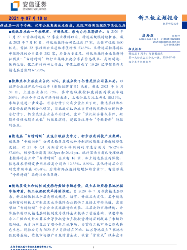 【安信证券】【20210718】新三板主题报告:精选层一周年专题,优质企业集聚效应形成,表现不俗彰显深改下良性生态-26页
