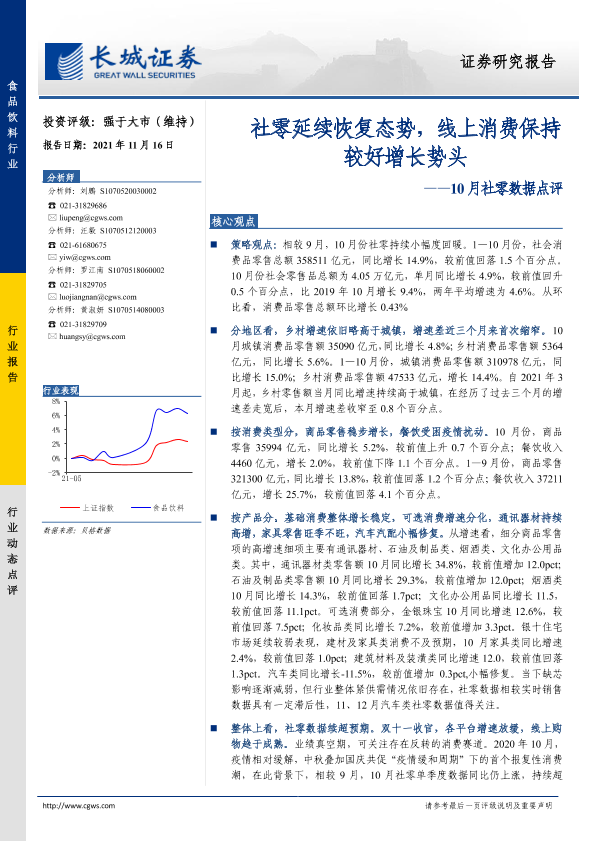 【长城证券】【20211116】食品饮料10月社零数据点评:社零延续恢复态势,线上消费保持较好增长势头-9页