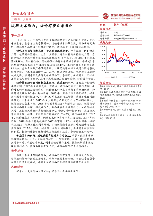 【东亚前海证券】【20211118】20211118-东亚前海证券-食品饮料行业点评报告:缓解成本压力,提价有望改善盈利-3页