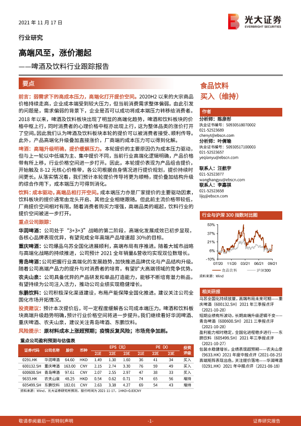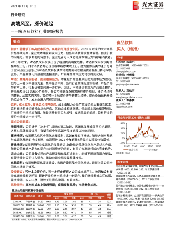 【光大证券】【20211117】啤酒及饮料行业跟踪报告:高端风至,涨价潮起-21页