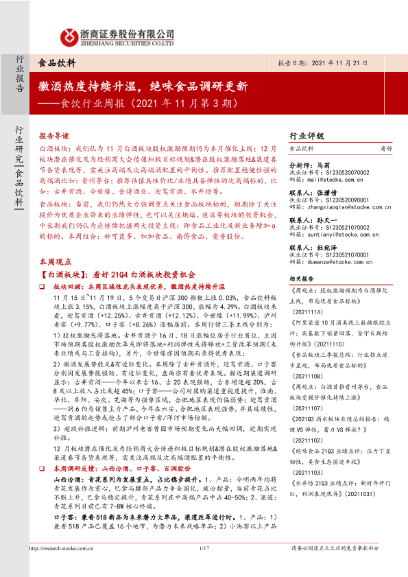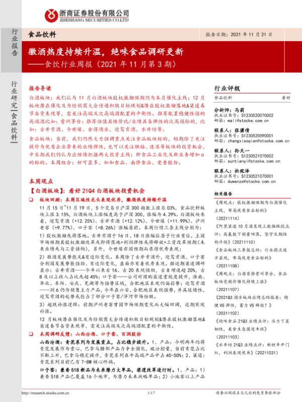 【浙商证券】【20211121】食饮行业周报(2021年11月第3期):徽酒热度持续升温,绝味食品调研更新-17页