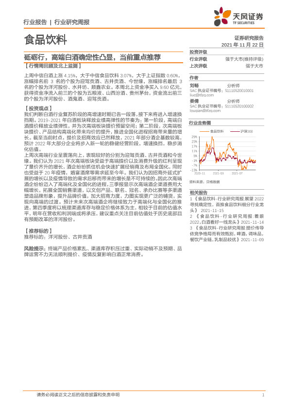 【天风证券】【20211122】食品饮料行业研究周报:砥砺行,高端白酒确定性凸显,当前重点推荐-7页