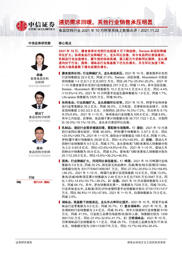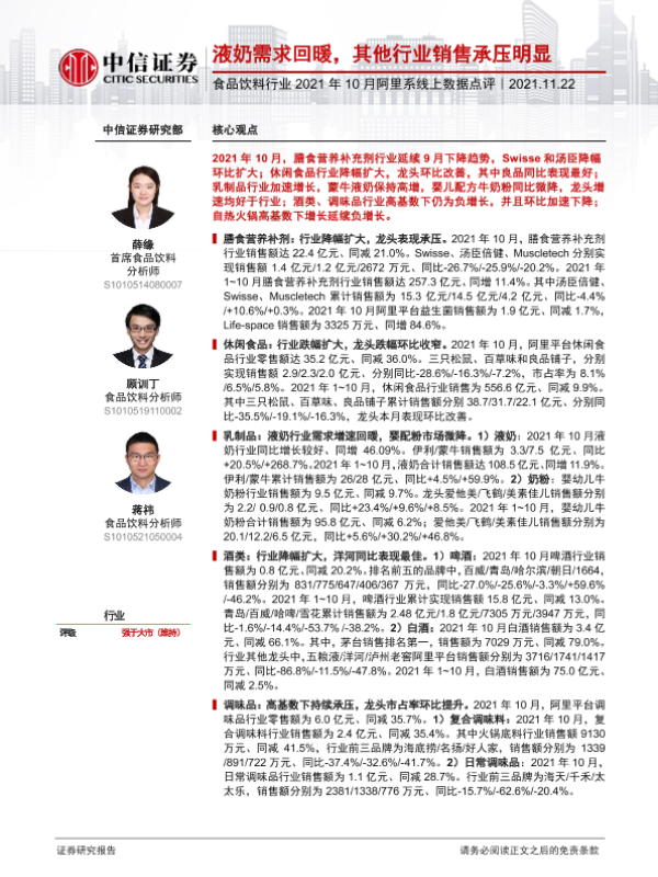 【中信证券】【20211122】食品饮料行业2021年10月阿里系线上数据点评:液奶需求回暖,其他行业销售承压明显-13页
