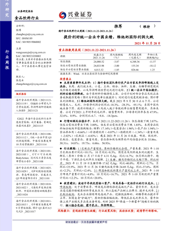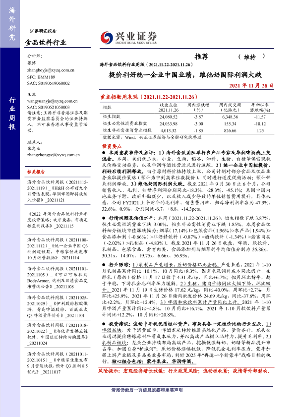【兴业证券】【20211128】海外食品饮料行业周报(2021.11.22-2021.11.26)提价利好统一企业中国业绩,维他奶国际利润大跌-10页