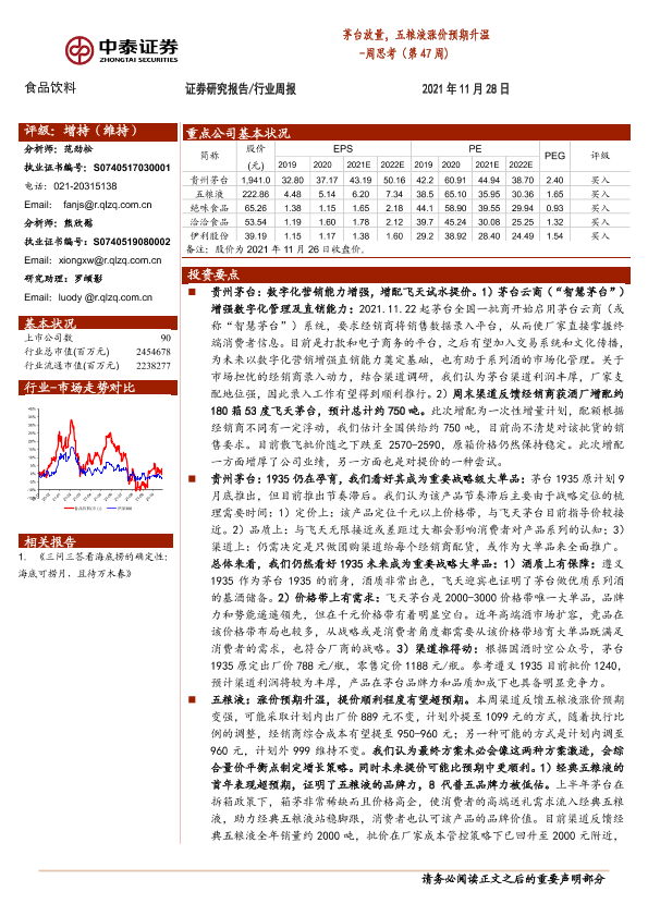 【中泰证券】【20211128】20211128-中泰证券-食品饮料周思考(第47周):茅台放量,五粮液涨价预期升温-10页