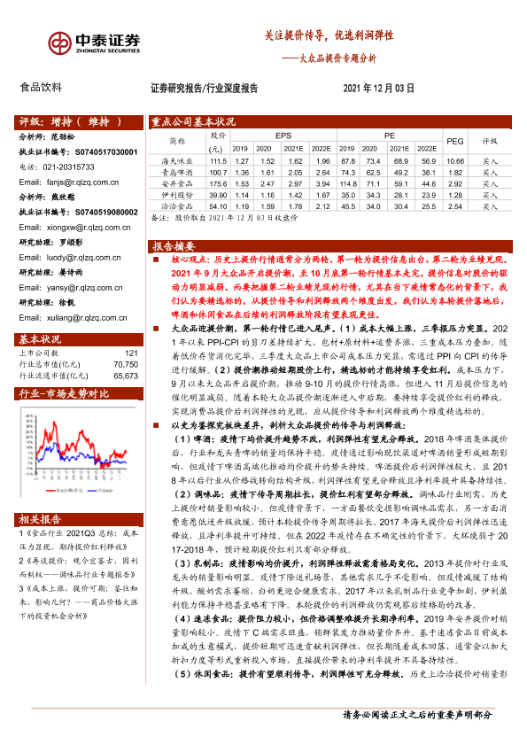 【中泰证券】【20211203】食品饮料:大众品提价专题分析:关注提价传导,优选利润弹性-28页