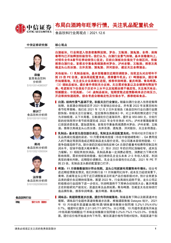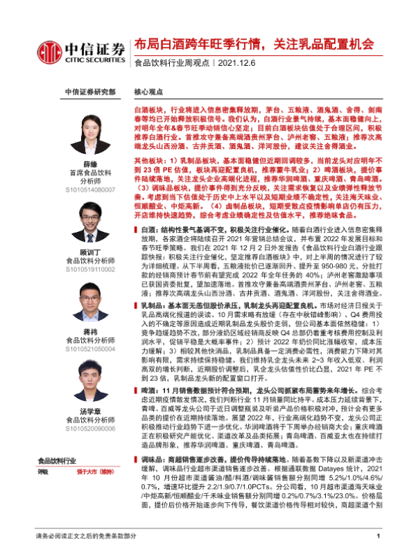 【中信证券】【20211206】食品饮料行业周观点:布局白酒跨年旺季行情,关注乳品配置机会-3页
