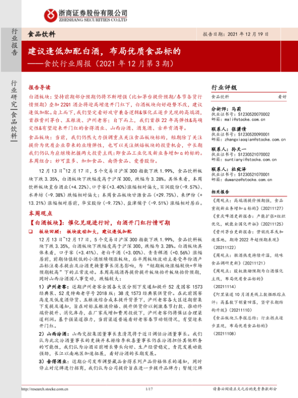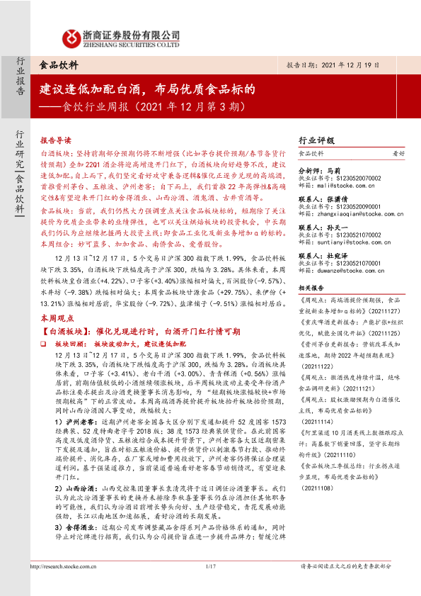【浙商证券】【20211219】食饮行业周报(2021年12月第3期):建议逢低加配白酒,布局优质食品标的-17页