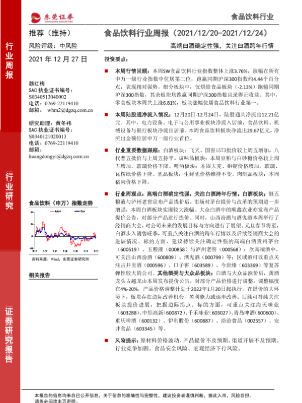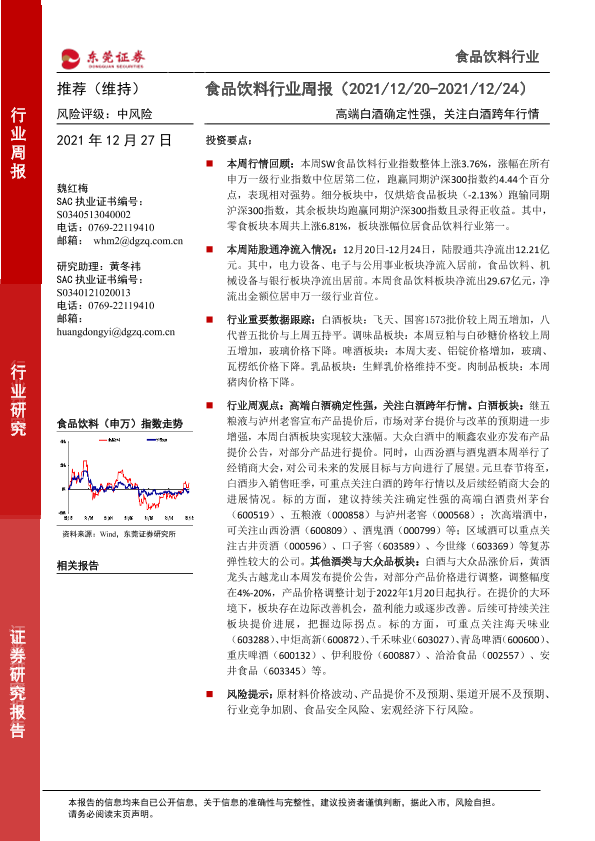【东莞证券】【20211227】20211227-东莞证券-食品饮料行业周报:高端白酒确定性强,关注白酒跨年行情-13页