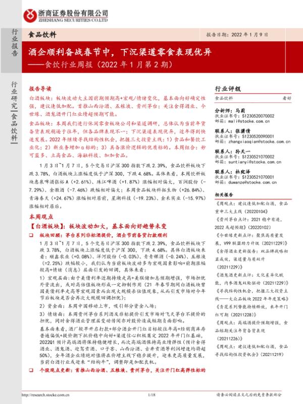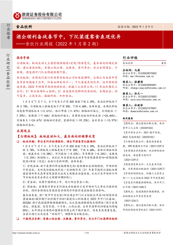【浙商证券】【20220109】食饮行业周报(2022年1月第2期):酒企顺利备战春节中,下沉渠道零食表现优异-18页