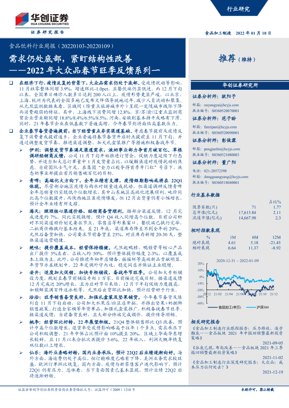 【华创证券】【20220110】2022年大众品春节旺季反馈系列一-需求仍处底部,紧盯结构性改善-8页