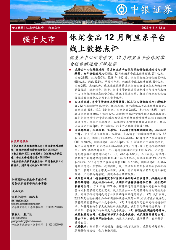 【中银证券】【20220112】休闲食品12月阿里系平台线上数据点评:流量去中心化背景下,12月阿里系平台休闲零食销售额延续下降趋势-5页