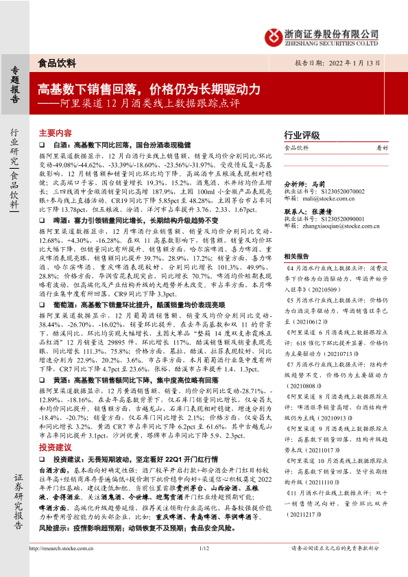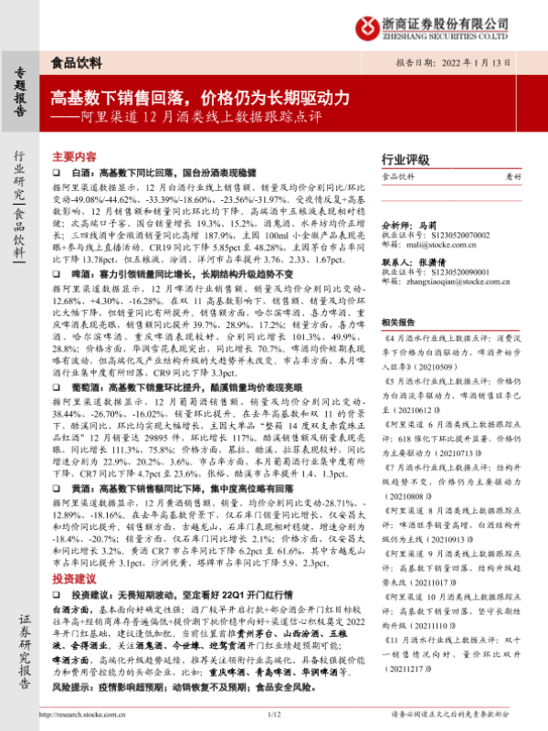 【浙商证券】【20220113】20220113-浙商证券-食品饮料行业:阿里渠道12月酒类线上数据跟踪点评:高基数下销售回落,价格仍为长期驱动力-12页