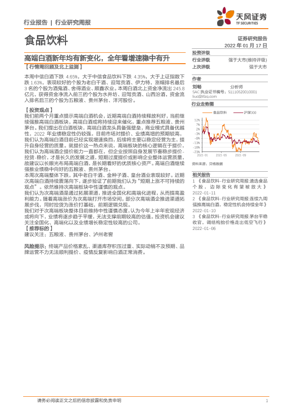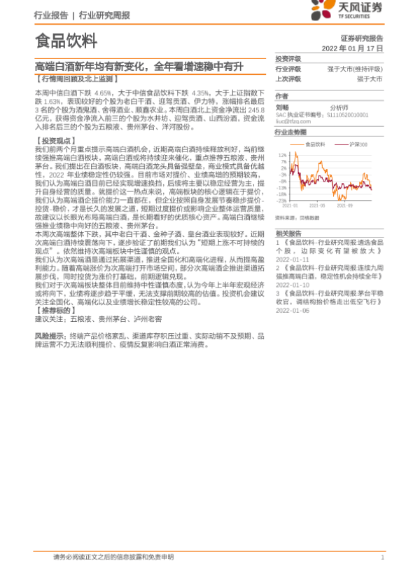 【天风证券】【20220117】食品饮料行业研究周报:高端白酒新年均有新变化,全年看增速稳中有升-7页