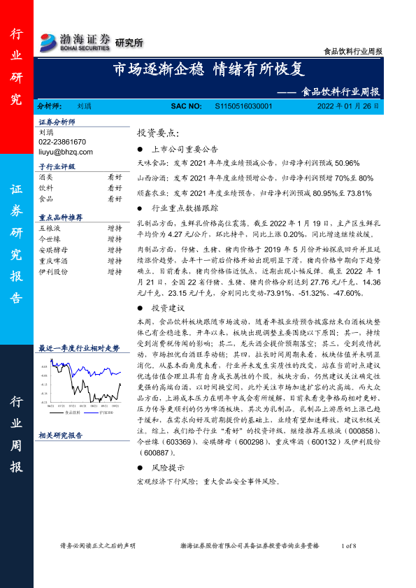 【渤海证券】【20220126】食品饮料行业周报:市场逐渐企稳 情绪有所恢复-8页