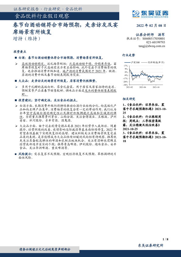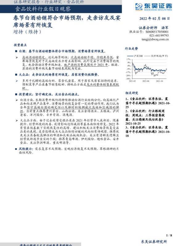 【东吴证券】【20220208】食品饮料行业假日观察:春节白酒动销符合市场预期,走亲访友及宴席场景有所恢复-8页