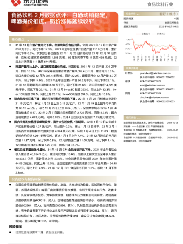 【东方证券】【20220209】食品饮料2月数据点评:白酒动销稳定,啤酒提价推进,奶价涨幅延续收窄-13页