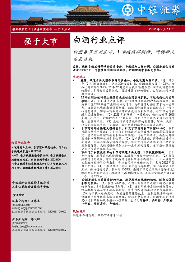 【中银证券】【20220211】白酒行业点评:白酒春节需求正常,1季报值得期待,回调带来布局良机-3页