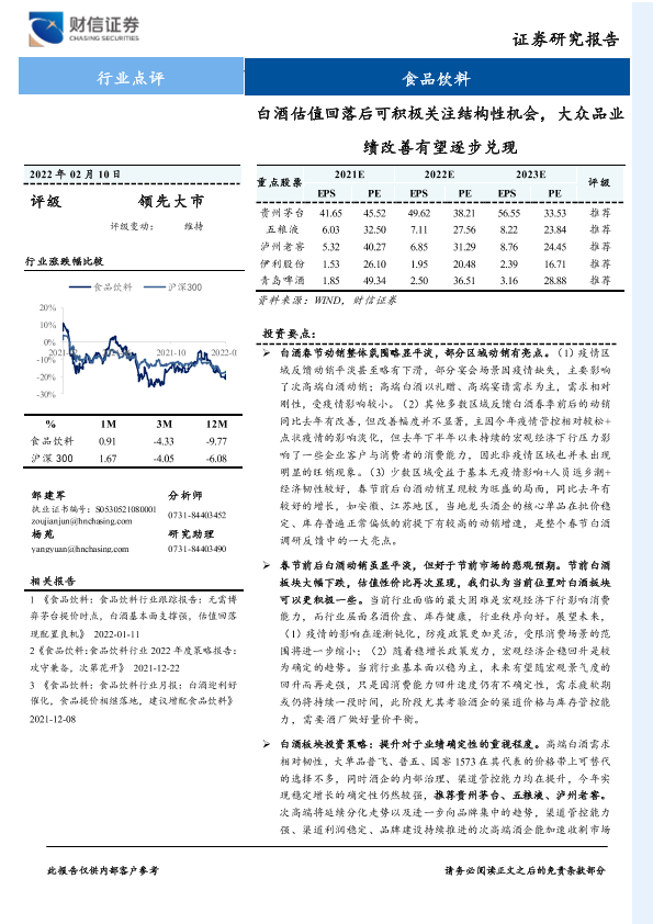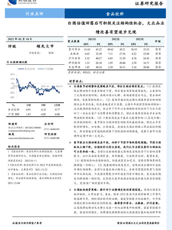 【财信证券】【20220210】食品饮料行业点评:白酒估值回落后可积极关注结构性机会,大众品业绩改善有望逐步兑现-12页