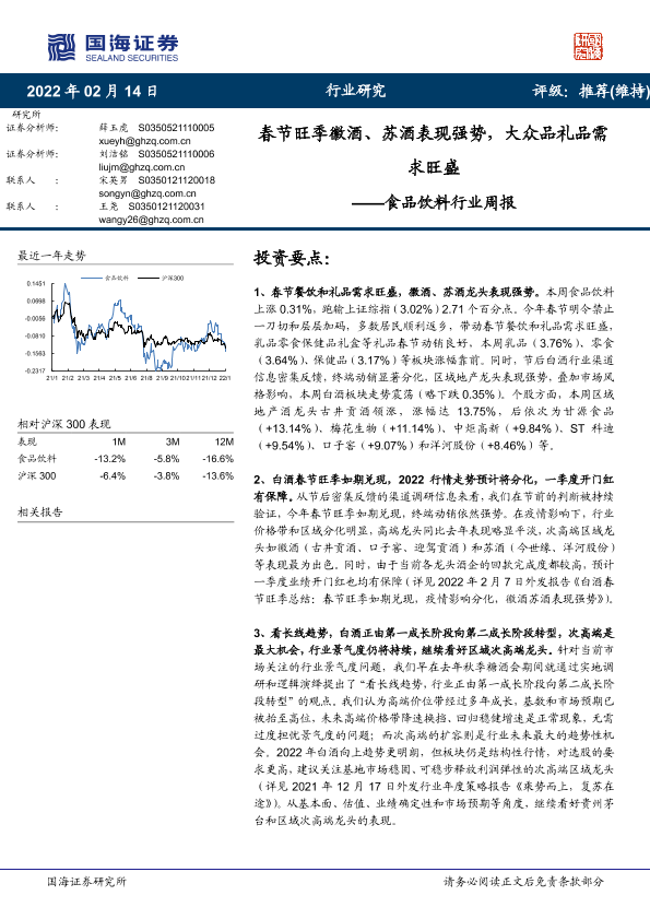 【国海证券】【20220214】20220214-国海证券-食品饮料行业周报:春节旺季徽酒、苏酒表现强势,大众品礼品需求旺盛-18页